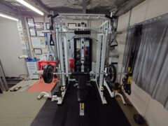 全ての要素に対応できなくてはならないので、3箇所にケーブルが付いたマルチラック、自走式トレッドミルマシン、プライオボックス、ヘックスバー、サンドバック、プロレスマットなど、ありとあらゆる器具を揃えています。